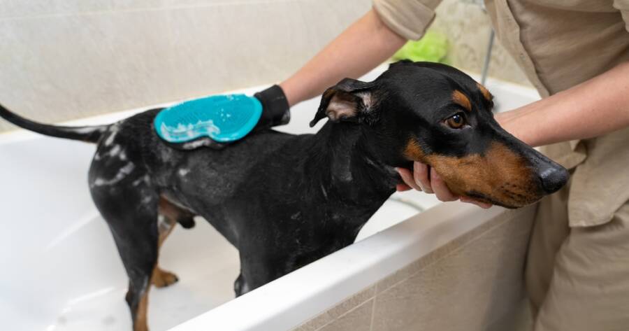 A matching conditioner can also help with detangling and softening, especially for longer coats. Just avoid using human products as they can be too harsh for your dog’s skin and throw off their pH balance.